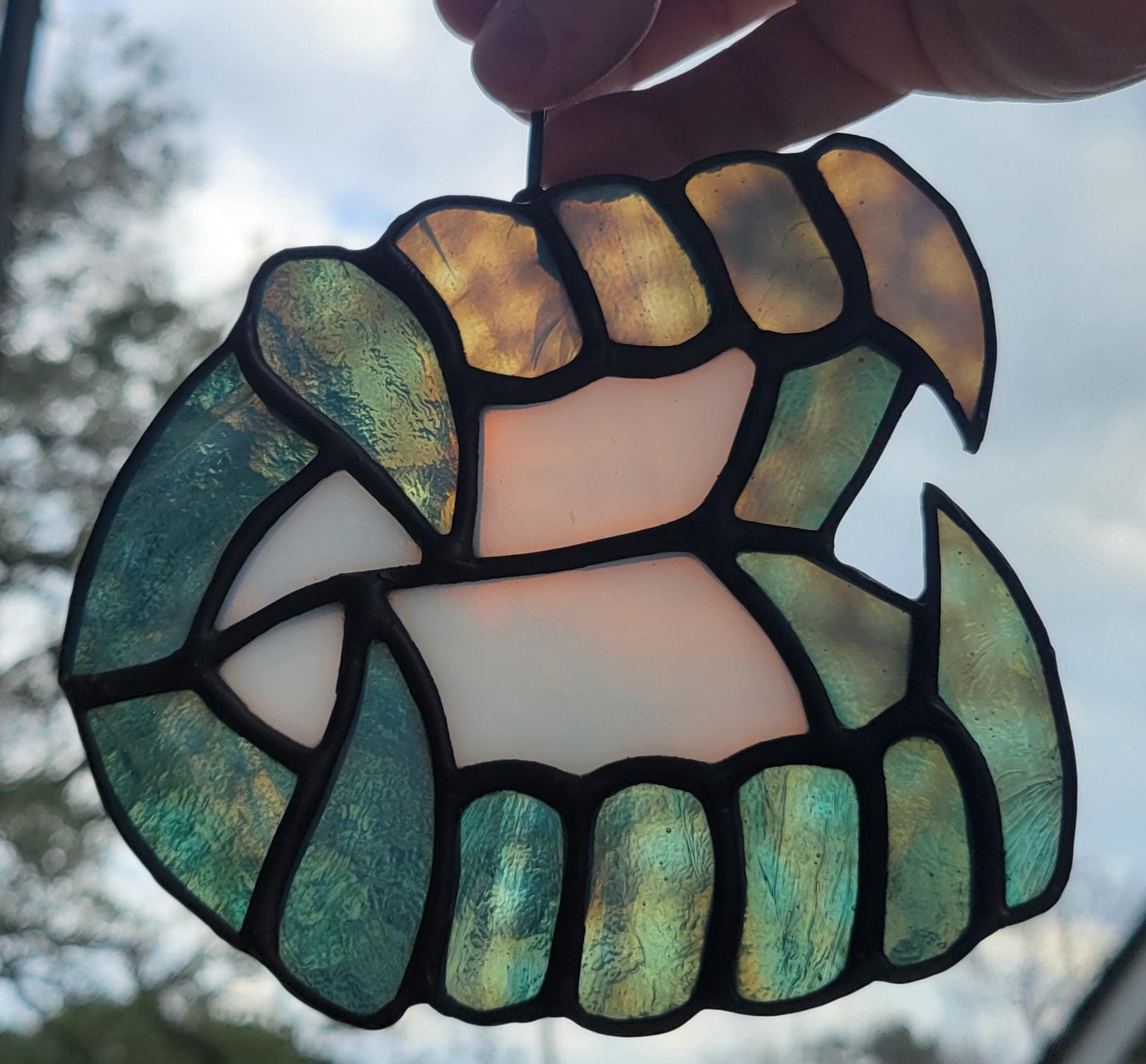 Perfect for Halloween, or year-round for those who appreciate the darkly beautiful, this suncatcher is more than just a decoration – it's a statement piece. Hang it in a window to catch the sunlight and watch as the colors dance and transform, or display it on a wall to add a touch of gothic charm to your home. Made in the Tiffany style with copper foil and solder.