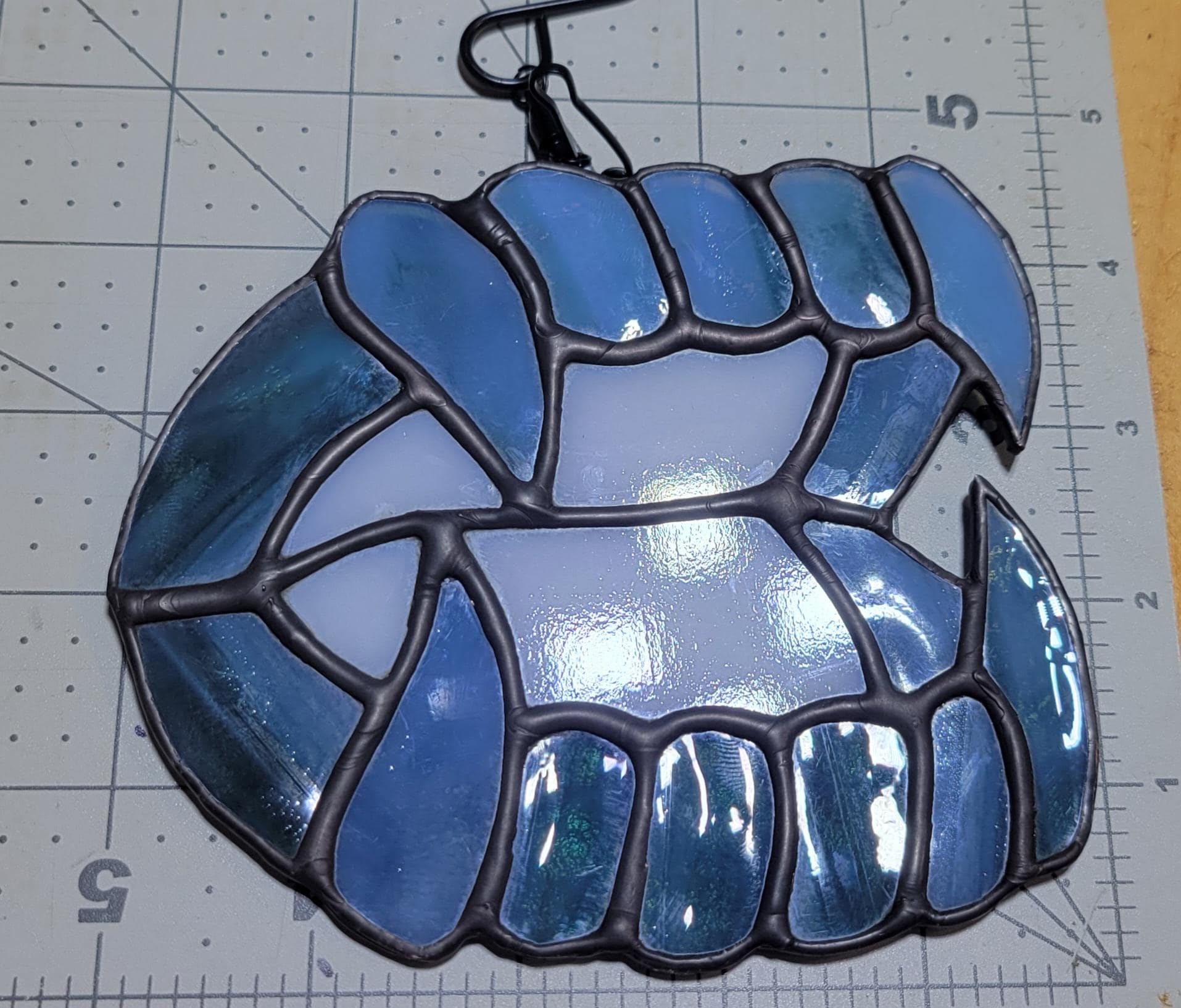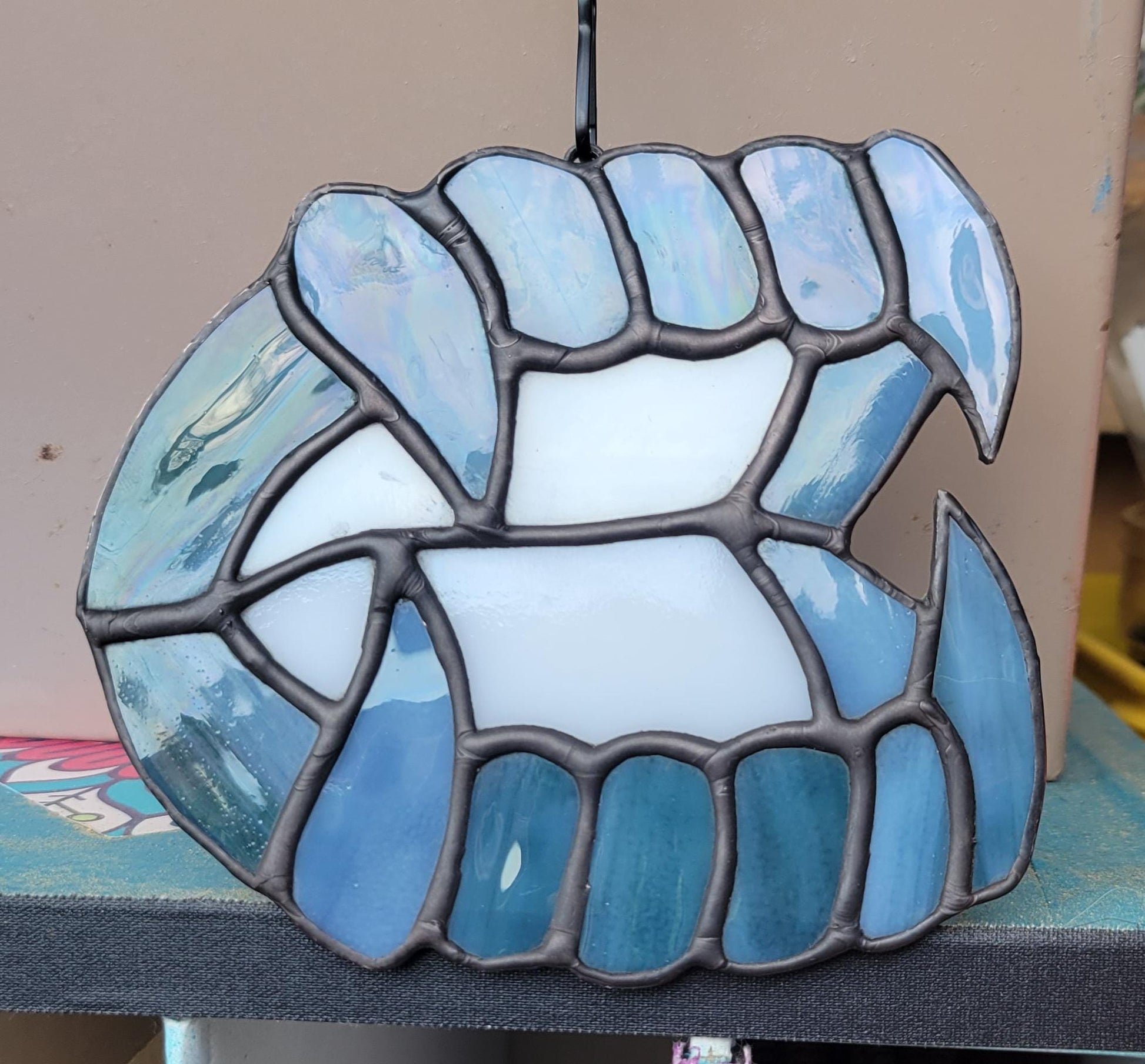 Embrace the mystique with this handcrafted vampire fangs suncatcher, a striking piece of dark artistry! Created with vintage bullseye glass, this unique piece captures the essence of gothic elegance and adds a touch of playful spookiness to any space. The fangs are fashioned from a deep, dark mottle glass, which shimmers with subtle hues of blues, greens, and beige in the light, creating an intriguing, almost otherworldly effect. The vintage bullseye glass adds a unique depth and texture, making this suncatcher a true one-of-a-kind treasure.